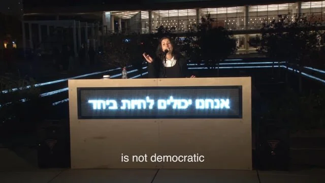 a performative-pop-up-broadcast-public art piece. Located for a day at city squares across Israel, VONS hosts and broadcasts viosionaries of peace, freedom and equality, allowing its audience and passersby to present questions and debate.